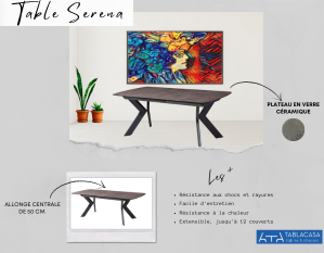 Qualitative et originale grâce à sa conception et son piétement en métal travaillé. Table rectangulaire coins arrondis ouverture centrale avec apparition automatique d’une allonge de 50 cm sera parfaite pour accueillir vos invités. Son plateau en verre céramique multiplie les avantages : résistance à la chaleur ou bien encore aux rayures. Cette matière est très utilisée pour ses propriétés et pour sa facilité d’entretien au quotidien.